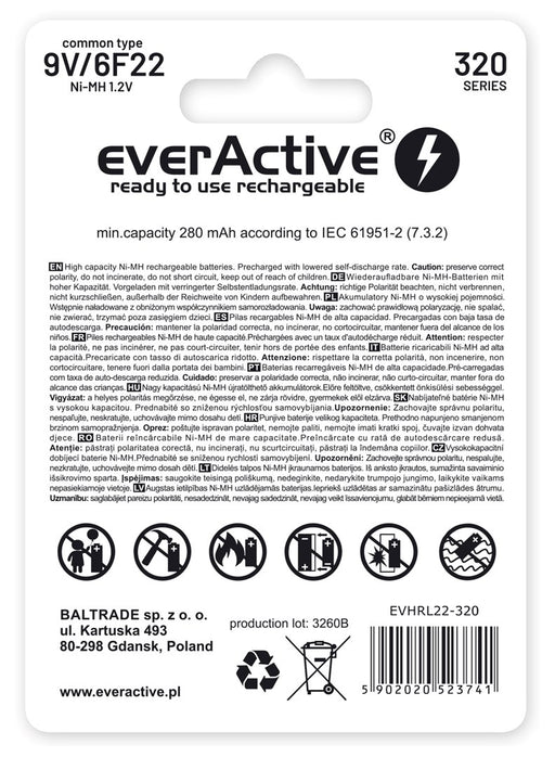 everActive8 in voorraadRechargeable batteries everActive Ni-MH 6F22 9V 320 mAh Professional Line